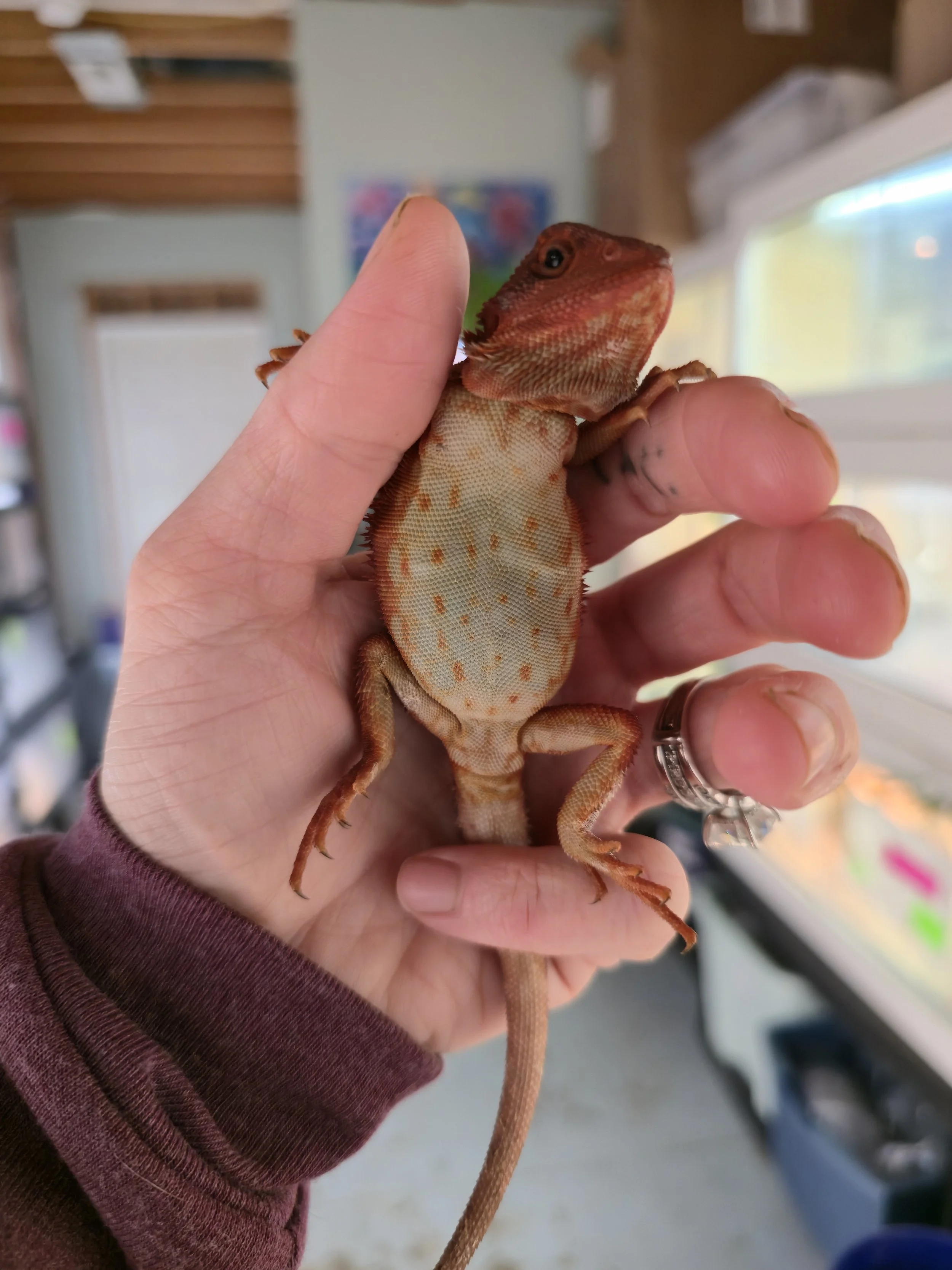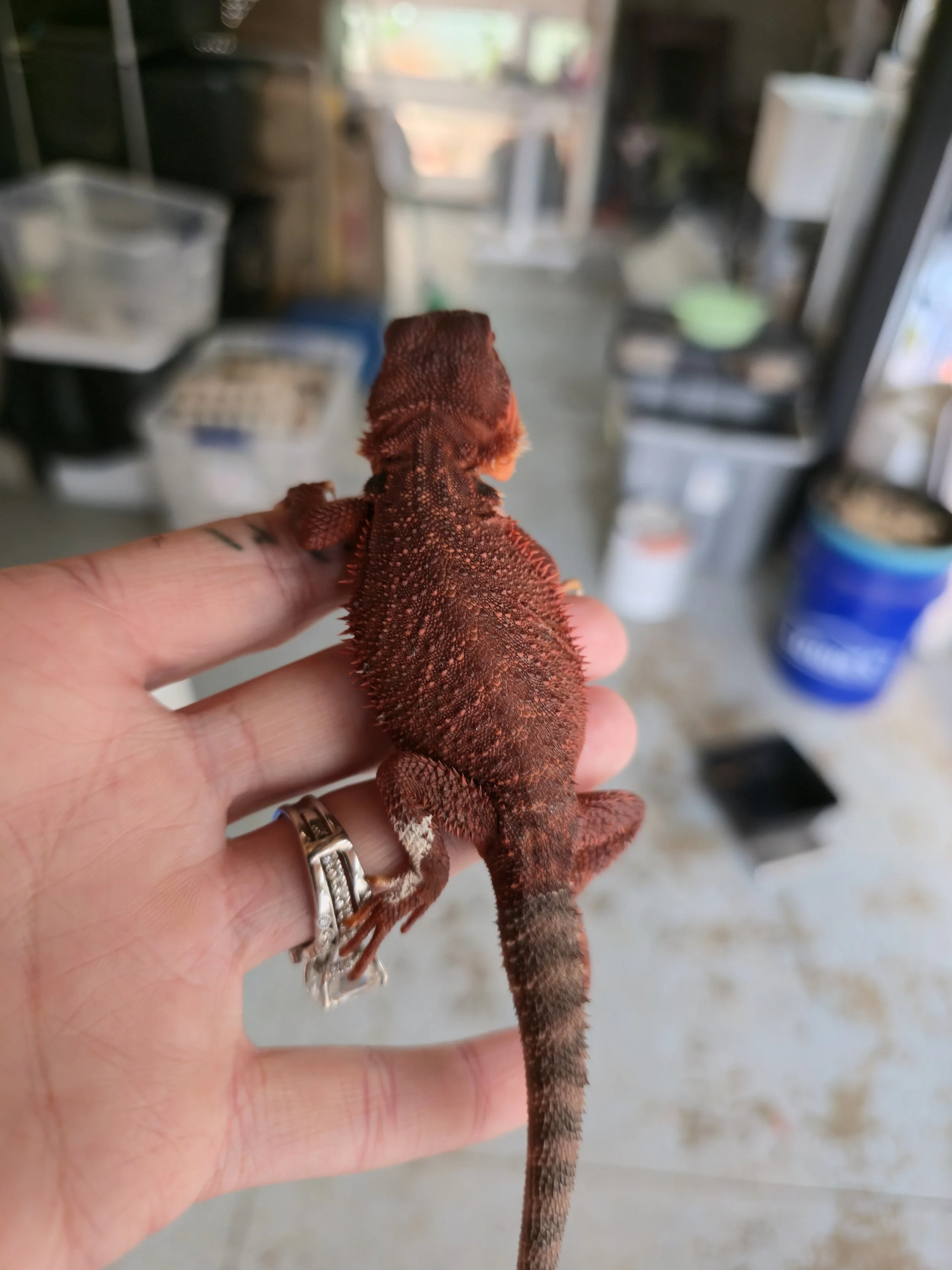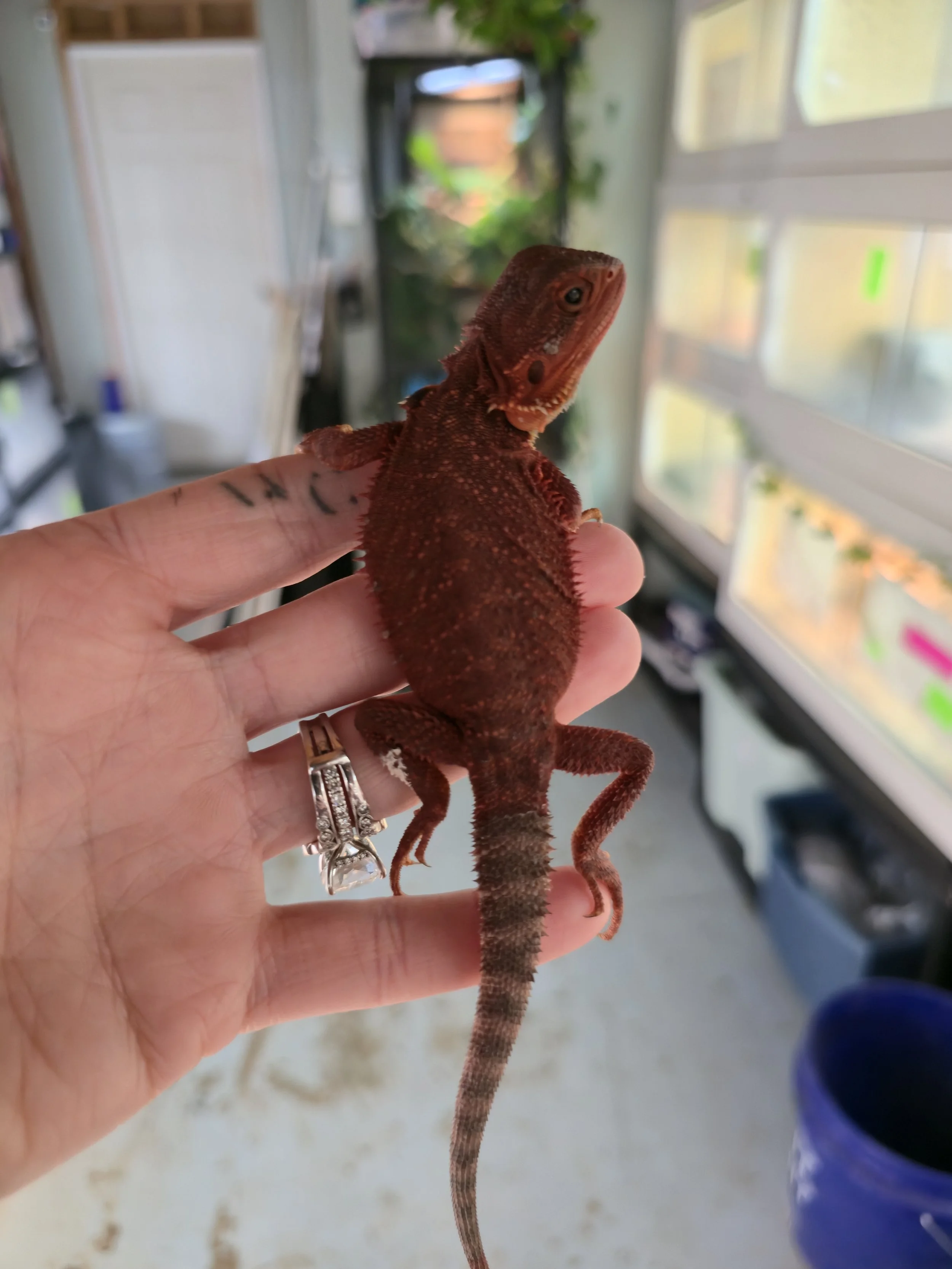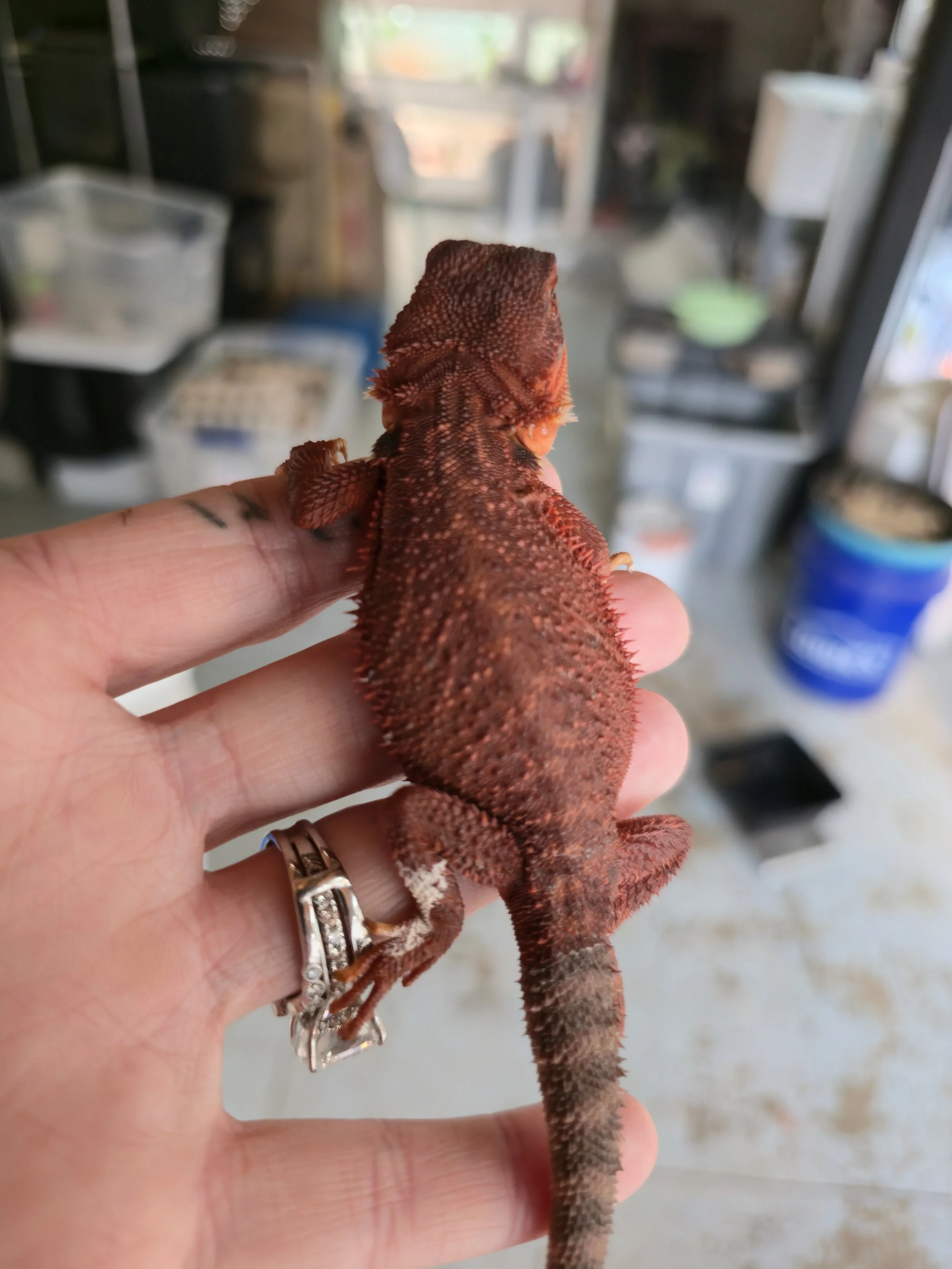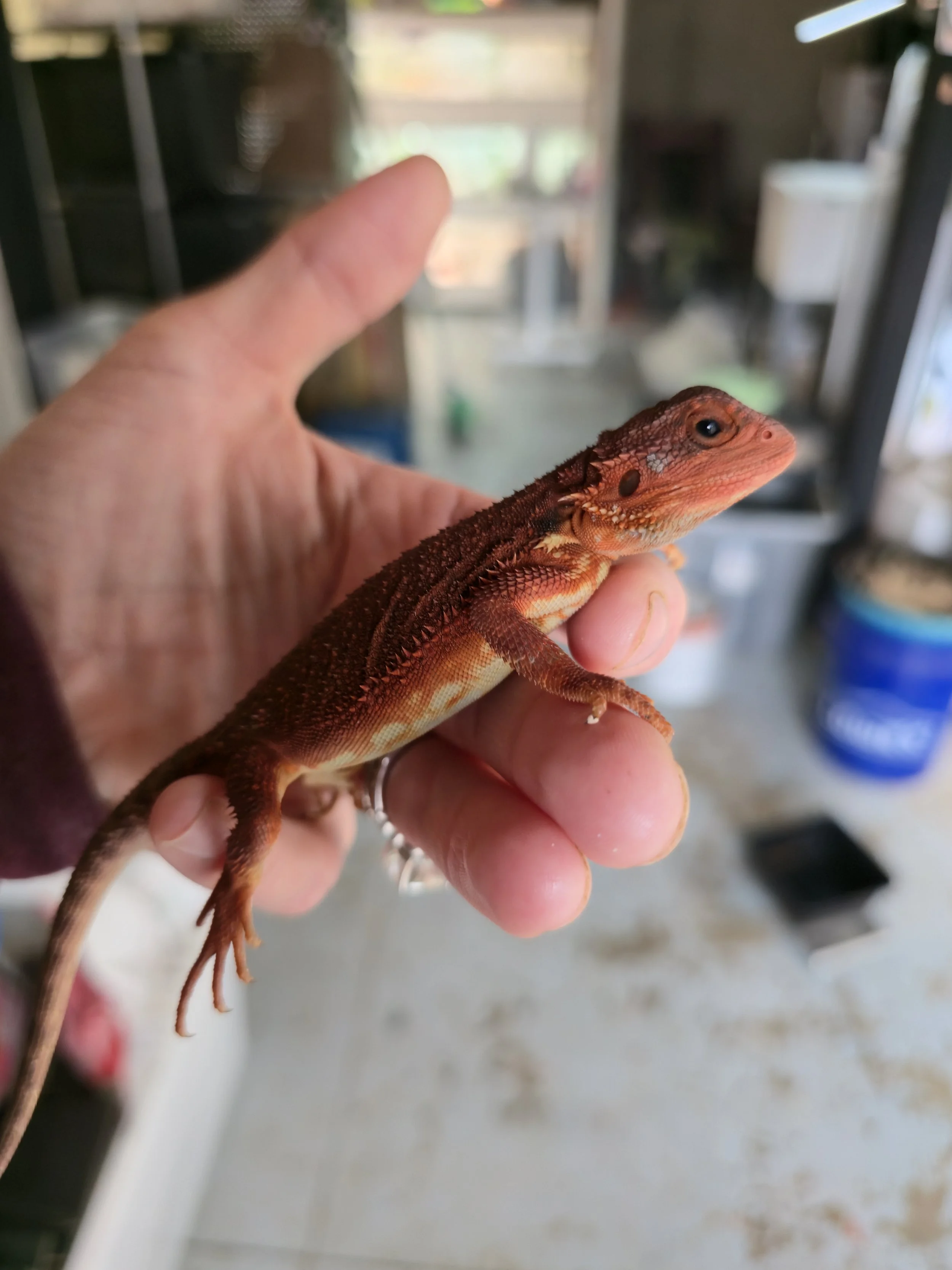 Currently around 30 grams and hatched 9/24/2025 from Freya (imported red from Tawaiin) and Loki (red monster).