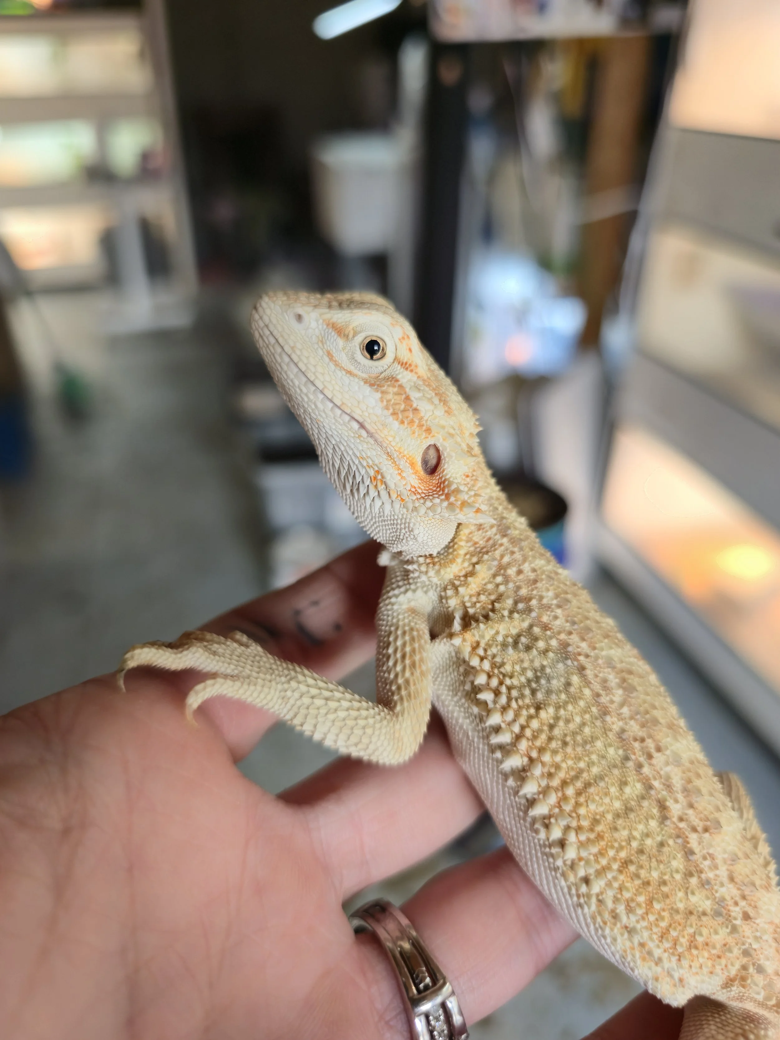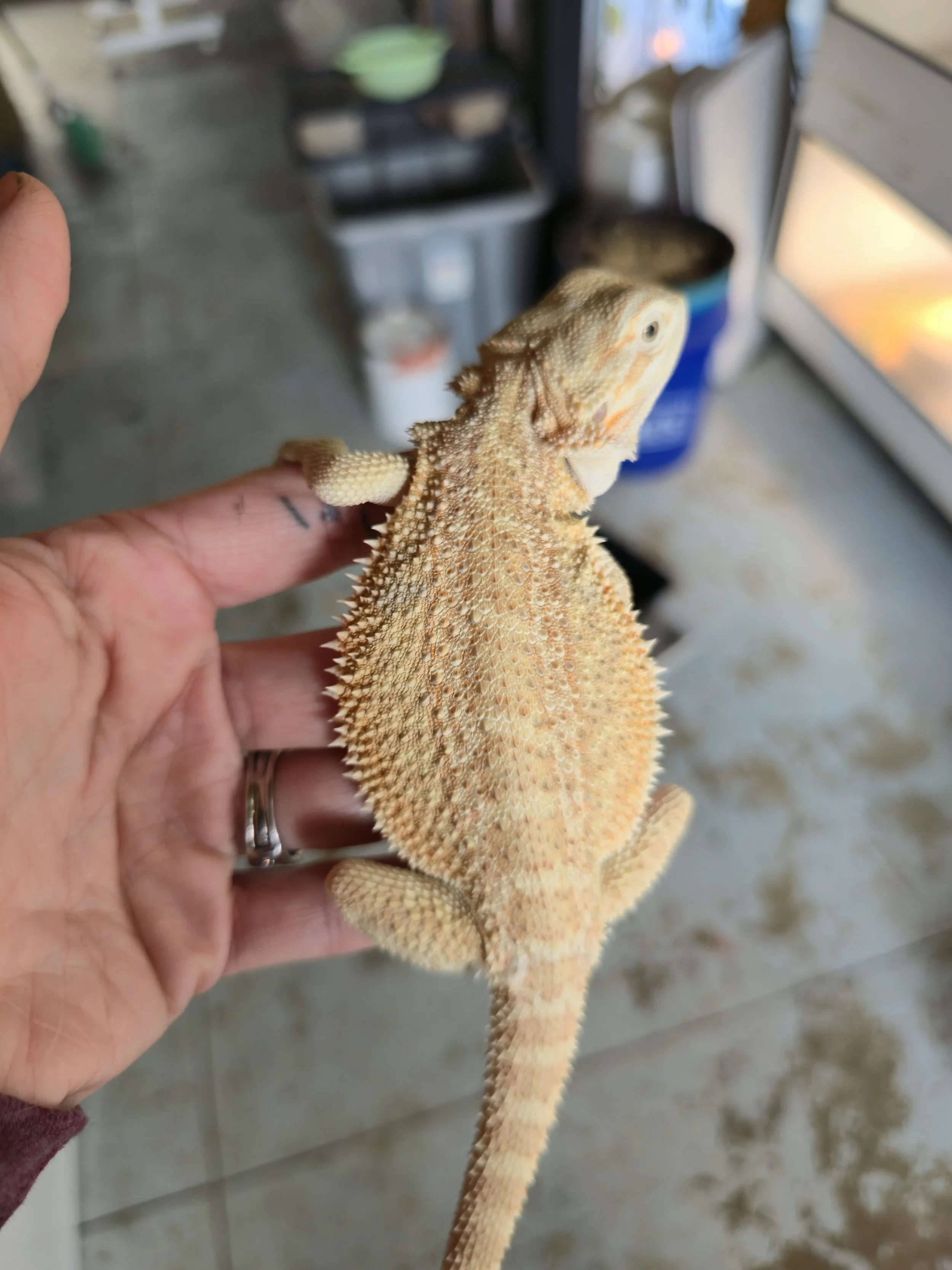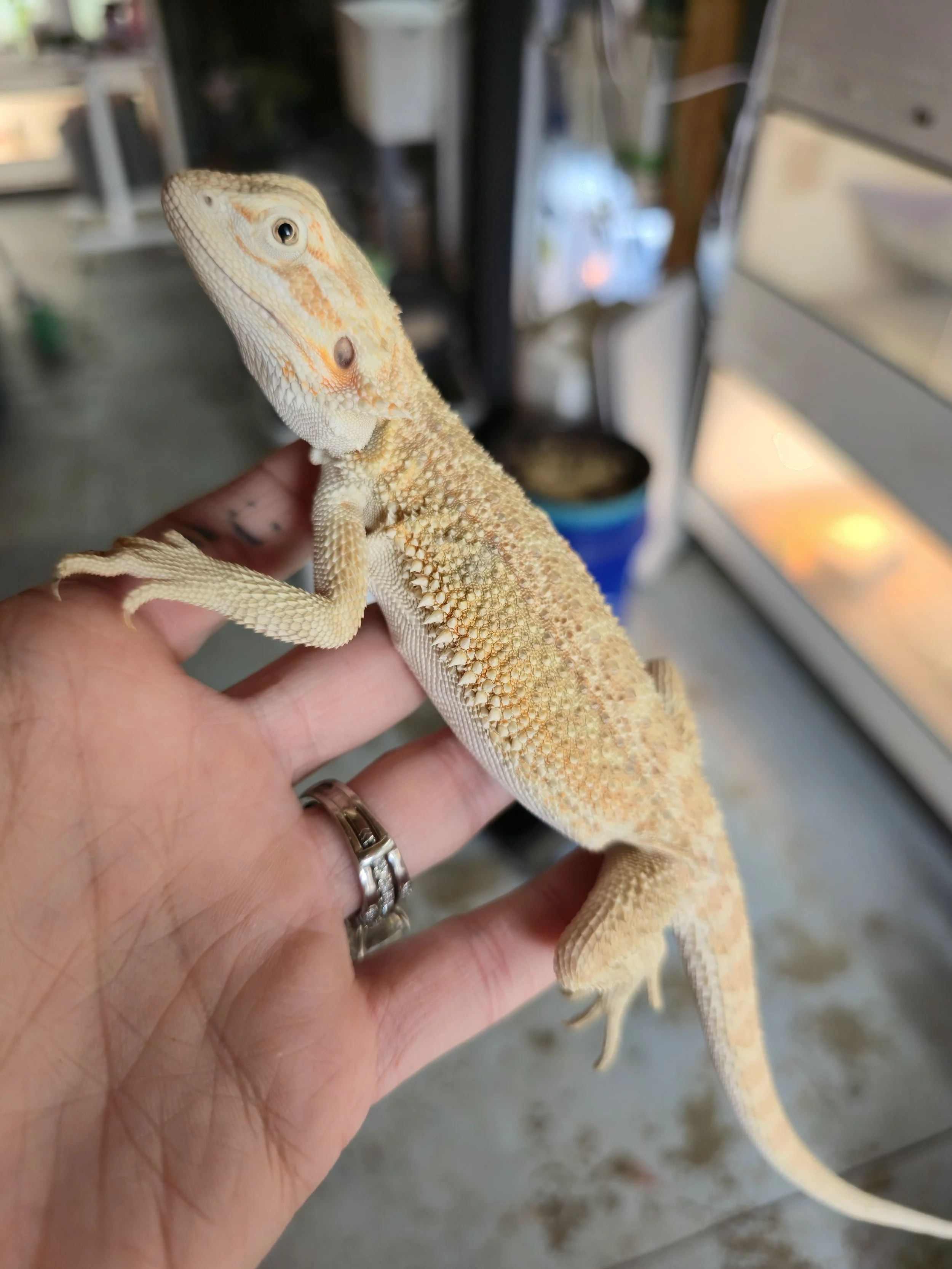 Weighing 68 grams and hatched 8/15/2025 from Ivy Mae and Brecken. Tip of tail is nipped but has been healed for many months. She has a big personality and lots of energy. Very food motivated and a little on the wild side but just enough to not be feral lol. She's gorgeous!