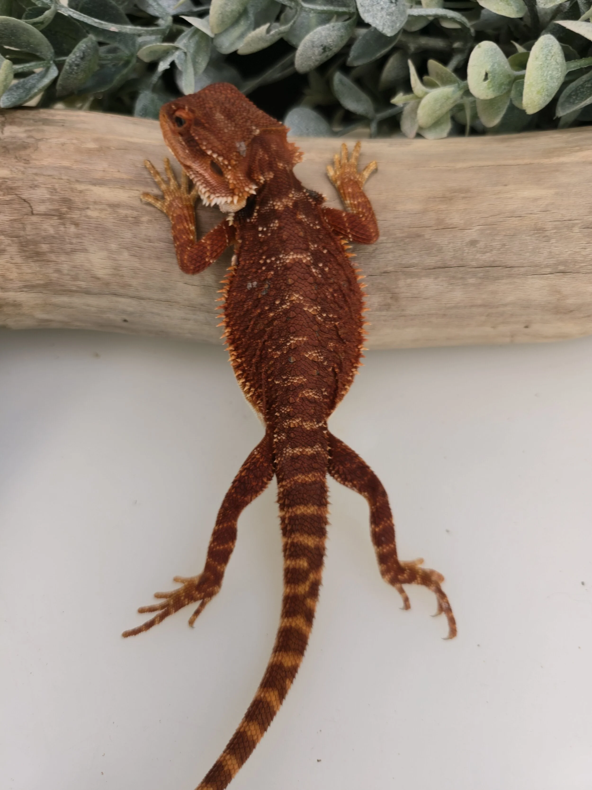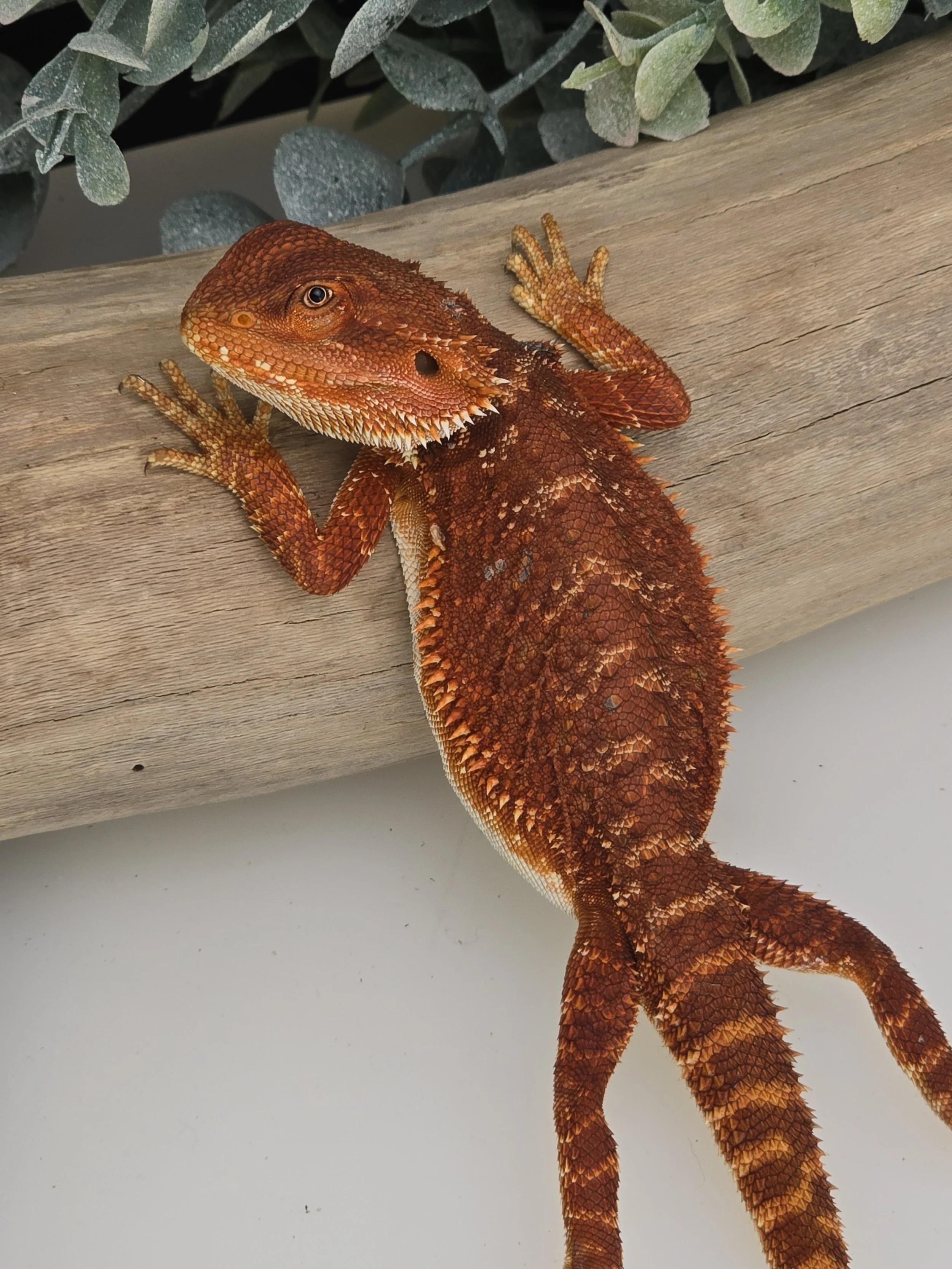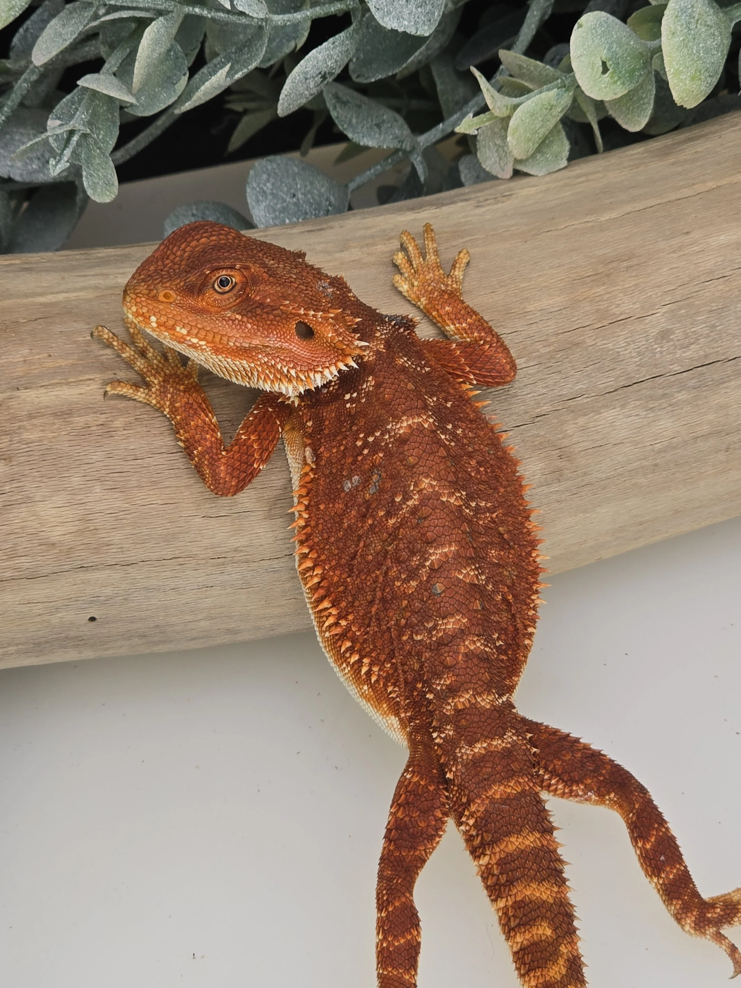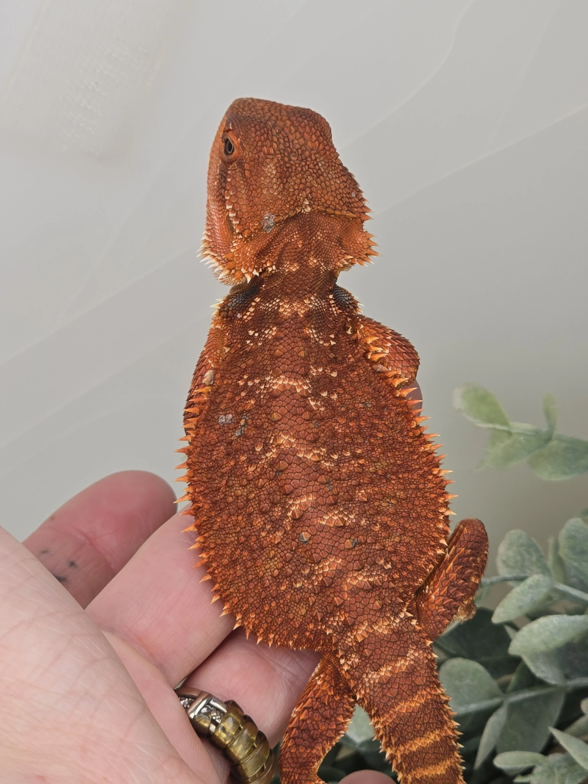 Absolutely stunning dragon. She hatched on 7/11/2025 and is very sweet and well started! She is a gorgeous dark maroon shade of red