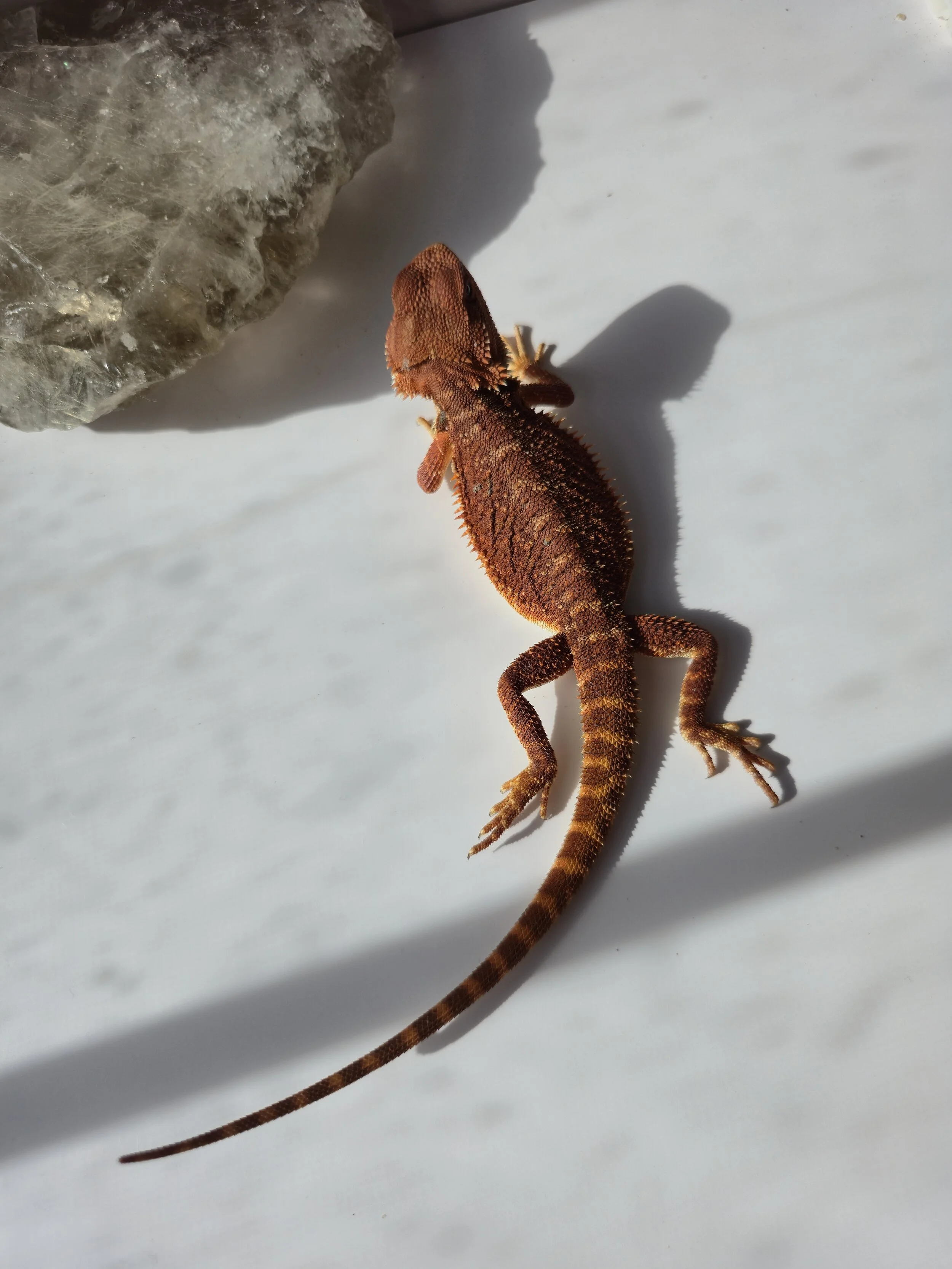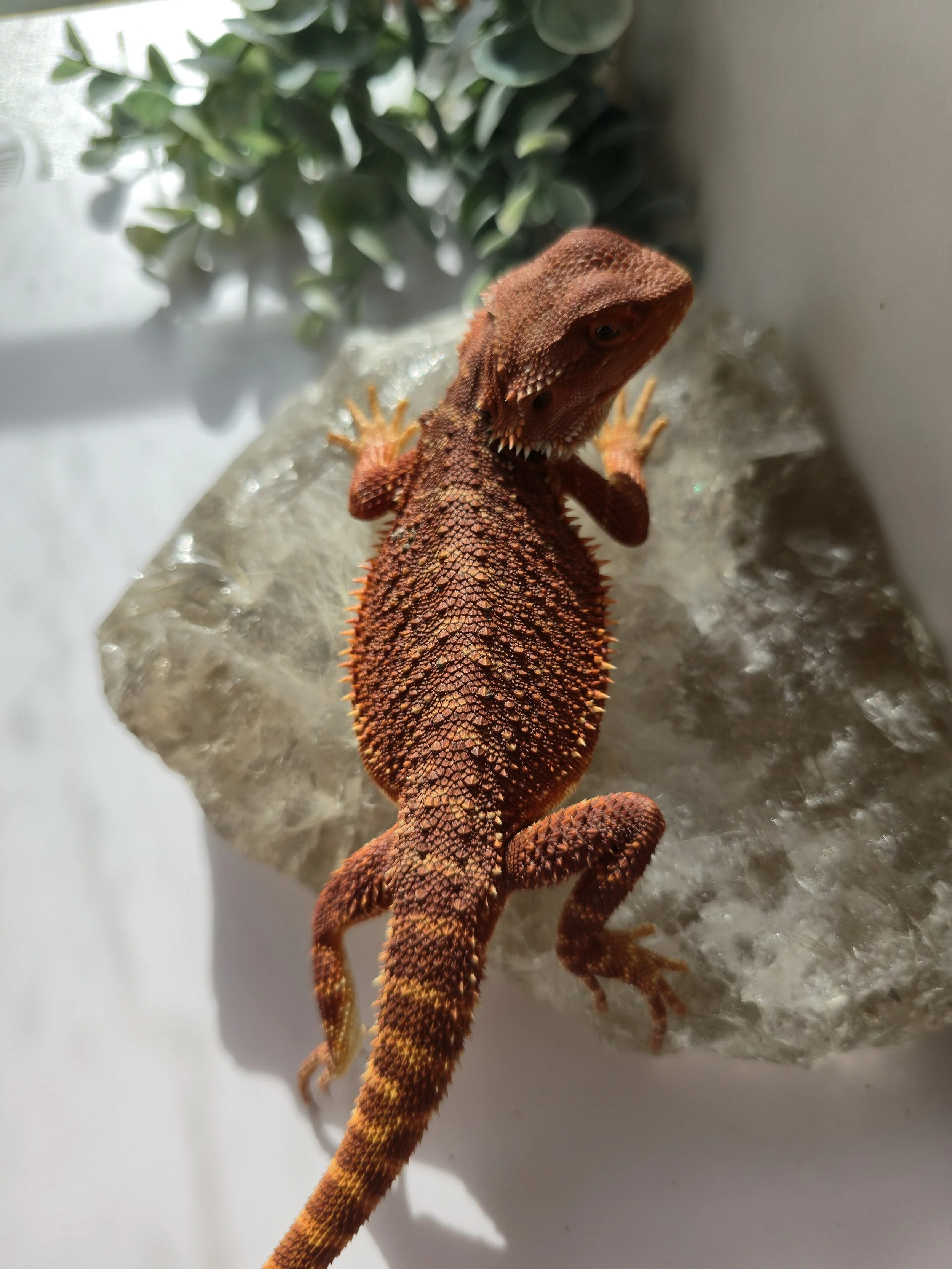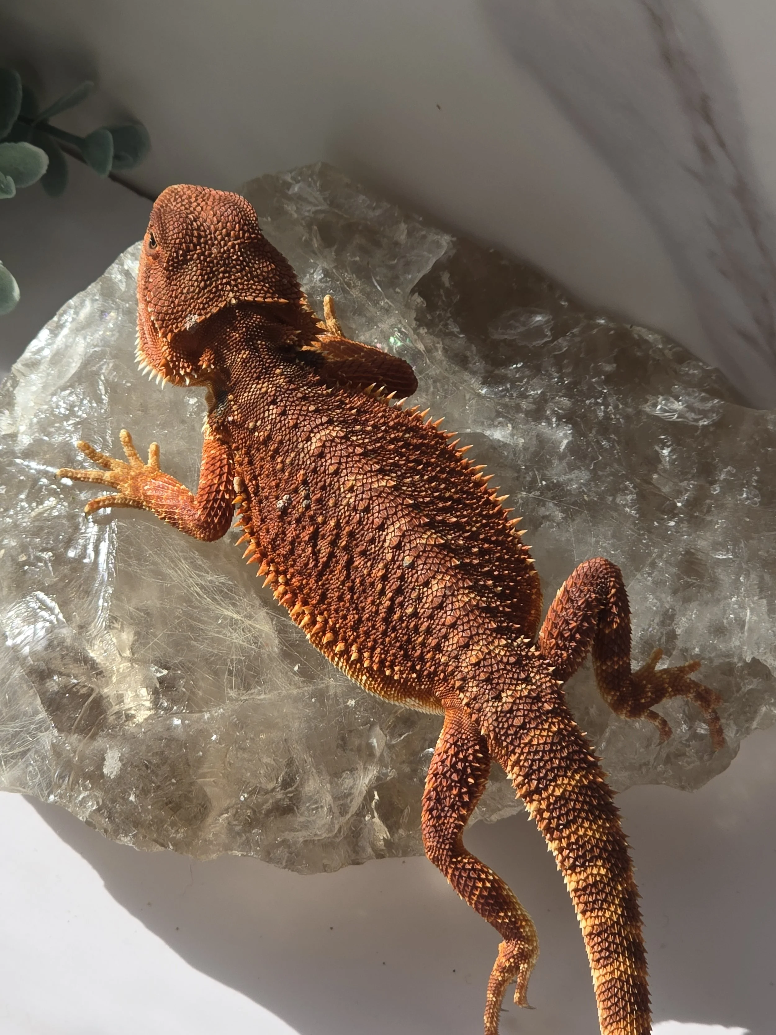 Absolutely stunning dragon. She hatched on 7/11/2025 and is very sweet and well started! She is a gorgeous dark maroon shade of red